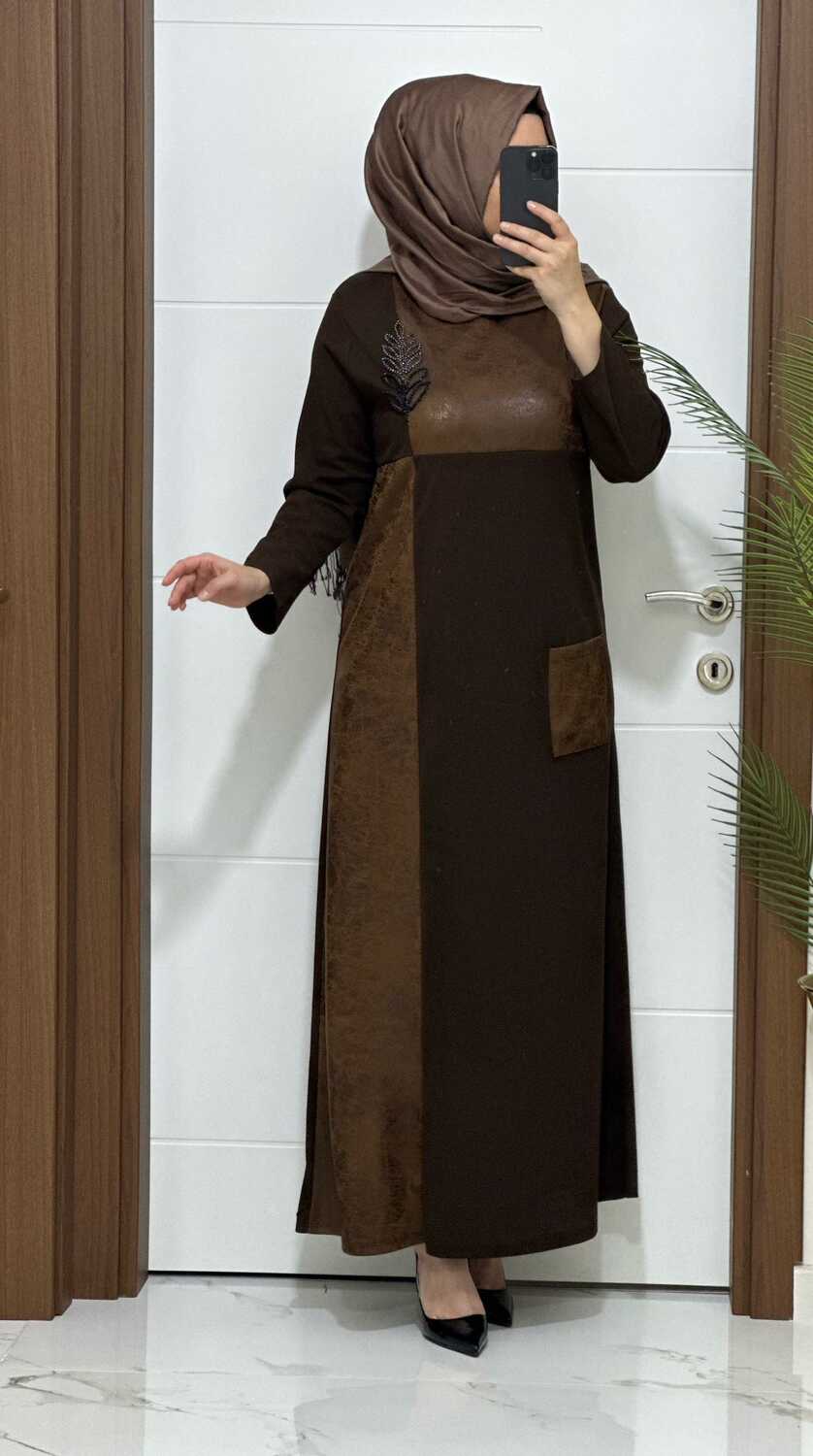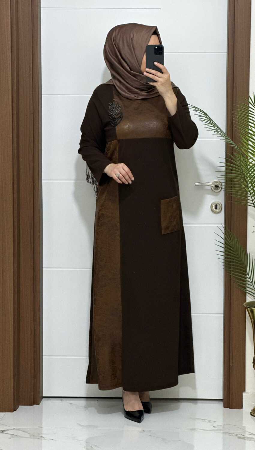 7152 K 100 KAHVERENK YAPRAK TAŞLI KREP ELBİSE