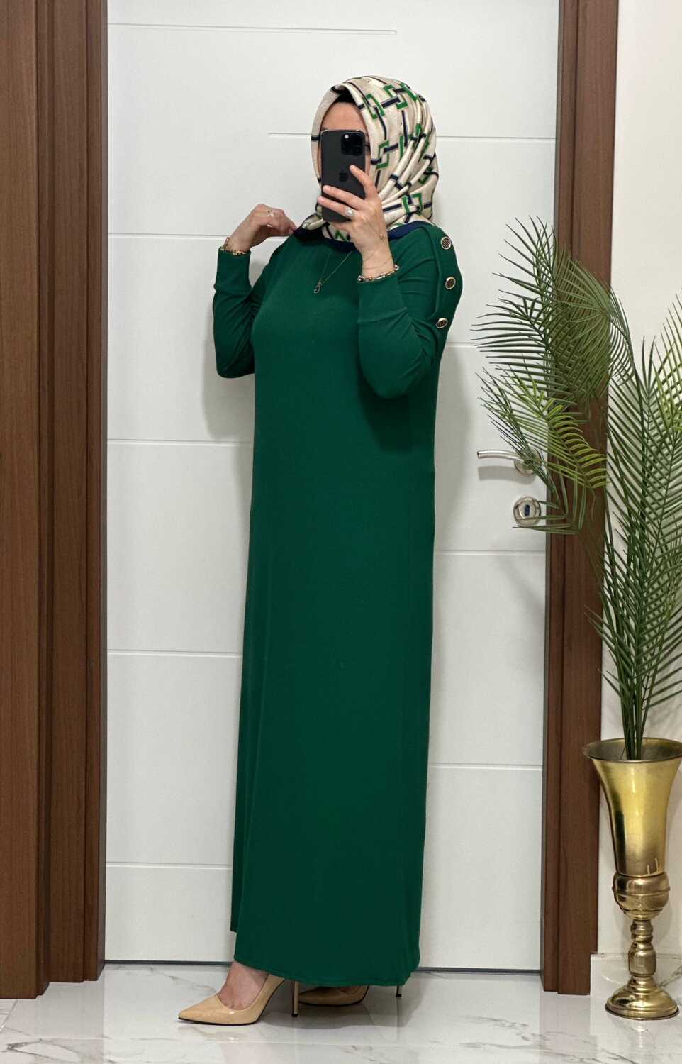 F11 K 80 ZÜMRÜT YEŞİLİ, OMUZ DÜĞMELİ LEYLA ELBİSE